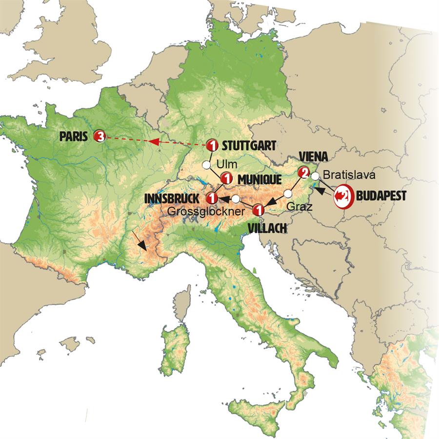 Budapeste, Bratislava, Viena, Salzburgo, Innsbruck, zugspitze, Feldkirch, Lago Constança , Lindau, Munique, Stuttgart, Heidelberg, Strasbourg, Paris.