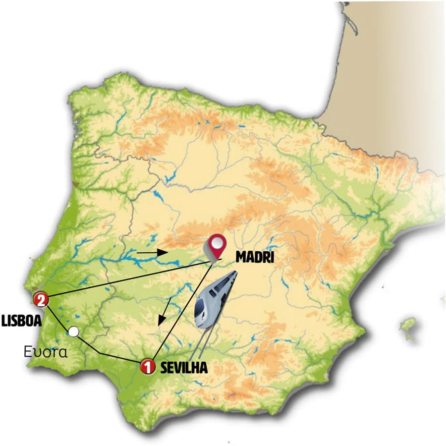 Madrid, Sevilha, Merida, Évora, Lisboa, Cáceres.