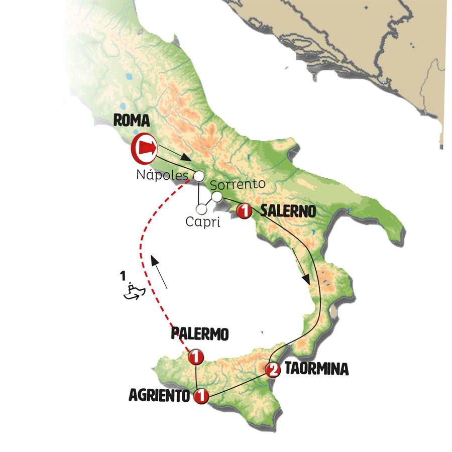 Roma, Nápoles, Capri, Sorrento, Salerno, Paola, mesina , Taormina, Catania, Siracusa, Agrigento, Marsala, Érice, Palermo, Monreale, ferri palermo napoles, Pompeia.