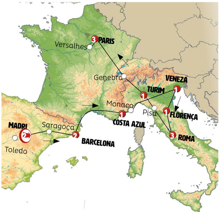 Madrid, Zaragoza, Poblet, Barcelona, Cote D´azur, Cidade de Mônaco, Gênova, Veneza, Florença, Roma, Pisa, Torino , Genebra, Paris.