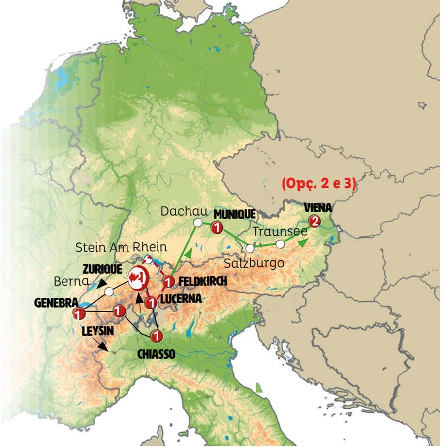 Zurich, Berna, Montreux, Genebra, lausana, Gruyeres, friburgo, Interlaken, aareschlucht, Lugano, chiasso, Bellinzona, Altdorf, Lucerna, Einsiedeln, Vaduz, Feldkirch, Lago Constança , Lindau, Munique, Salzburgo, St. Wolfgang, Lago Traunsee, Viena.
