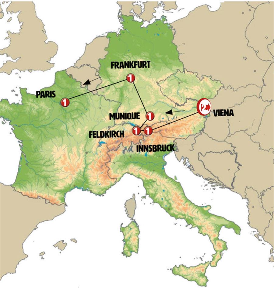 Viena, Salzburgo, Innsbruck, zugspitze, Feldkirch, Lago Constança , Lindau, Munique, Füssen, Rotemburgo, Frankfurt, Luxemburgo, Reims, Paris.