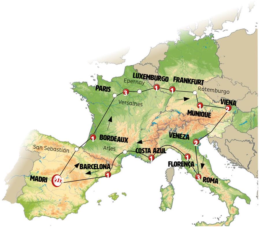 Madrid, San Sebastian, Bordeaux, Chambord, Paris, Bouillon, Luxemburgo, Cochem, crucero por el rhin, Frankfurt, Rotemburgo, Munique, Salzburgo, St. Wolfgang, Lago Traunsee, Viena, Bratislava, region de carintia , Veneza, Ravena, Assis, Roma, Florença, Pisa, SESTRI LEVANTE, Montecarlo, Cote D´azur, Arles, Barcelona.