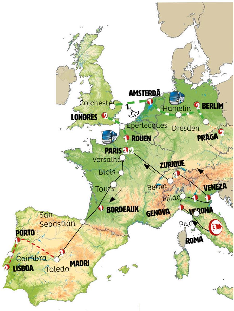Roma, Pisa, Santa Margherita Ligure, Portofino, Gênova, san giulio, Milão, Verona, Veneza, Lugano, Lucerna, Zurich, Strasbourg, Paris, Rouen, canal de la mancha, Canterbury, Londres, colchester, ferri colchester volendam, Volendam, Amsterdã, Hamelin, Berlim.