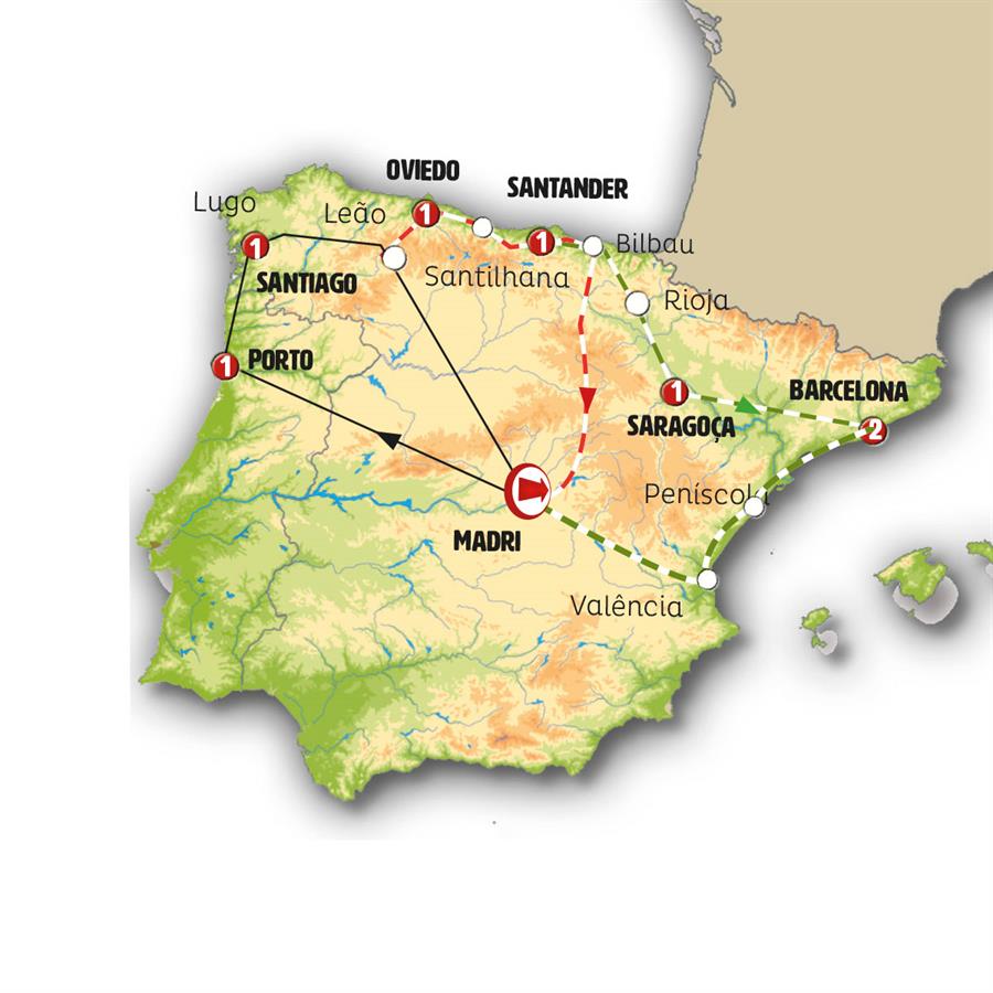 Madrid, Cidade Rodrigo, Porto, Santuario do Bom Jesus, Cambados, Santiago de Compostela, Lugo, Cebreiro, León, Oviedo, Covadonga, Santilhana, Santander, Bilbao, Area de Serviço Foronda, La Rioja, Zaragoza, Poblet, Barcelona, peniscola, Valência.