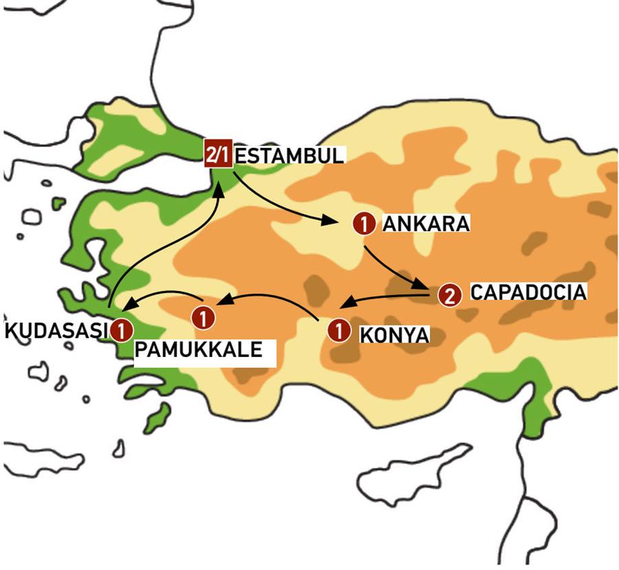 Istambul, Ankara, Capadócia, ihlara , Konya, Egirdir, Pamukkale, Éfeso, Kusadasi, Esmirna, Bursa.