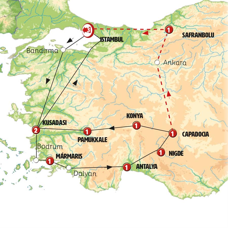 Istambul, Éfeso, Kusadasi, Bodrum, Marmaris, Dalyan, Antalya, aspendo, Side, karaman , Nigde, Capadócia, Safranbolu, gokgol magarasi , eregli.