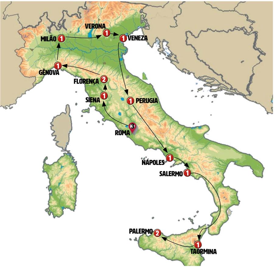 Roma, Orvieto, Castiglione Del Lago, Siena, Monteriggioni, San Gimignano, Florença, Pisa, Cinque Terre, Gênova, Portofino, Milão, Região dos Lagos, Verona, Veneza, Pádua, San Marino, Gubbio, Perugia, Assis, Nápoles, Capri, Sorrento, Salerno, Paola, mesina , Taormina, Giardini Naxos , villa romana del casale, Palermo.