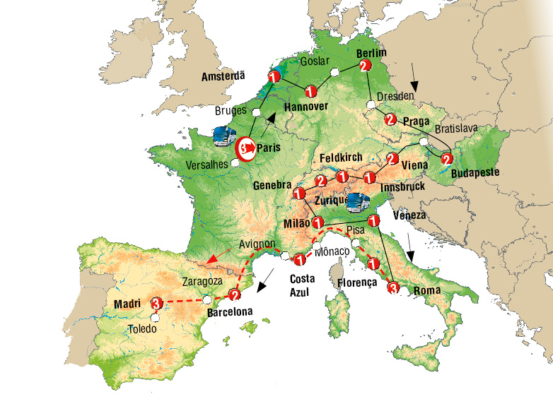 Paris, Bruges, Amsterdã, Hannover, Goslar, Berlim, Dresden, Praga, Lednice, Gyor, Budapeste, Bratislava, Viena, Salzburgo, Innsbruck, zugspitze, Feldkirch, saint gallen, Constança, Stein Am Rhein S, cataratas del rin, Zurich, Berna, Montreux, Genebra, Milão, Veneza, Ravena, Assis, Roma.