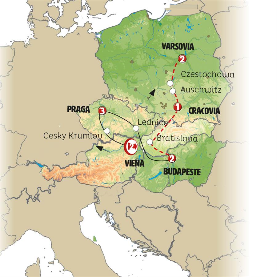 Viena, Linz, Cesky Krumlov, Praga, Lednice, Gyor, Budapeste.