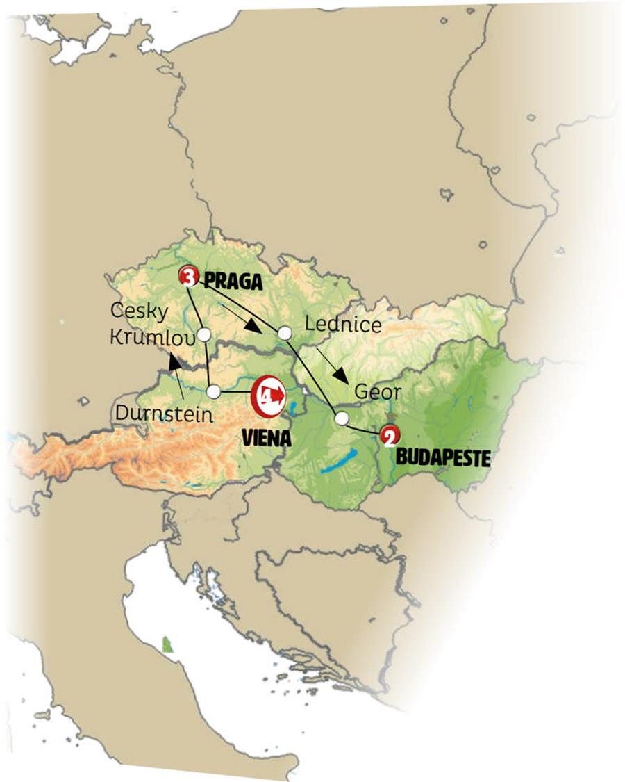 Viena, Linz, Cesky Krumlov, Praga, Lednice, Gyor, Budapeste.