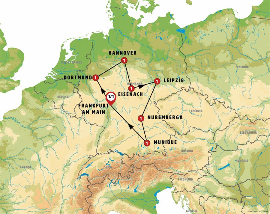 Frankfurt, crucero por el rhin, Colônia, Dortmund, ruta cuentos de hadas, Hannover, Goslar, gotinga, bad sooden, Eisenach, Gotha, Erfurt, Leipzig, Dresden, Bamberg, Nuremberg, kloster weltenburg, Dachau, Munique, Füssen, Rotemburgo.