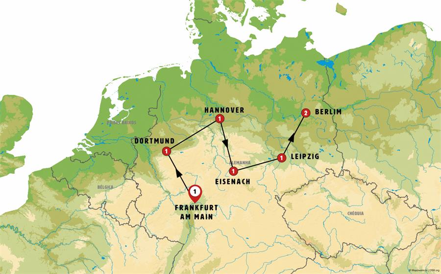 Frankfurt, crucero por el rhin, Colônia, Dortmund, ruta cuentos de hadas, Hannover, Goslar, gotinga, bad sooden, Eisenach, Gotha, Erfurt, Leipzig, Dresden, Meissen, moritzburg, Berlim.