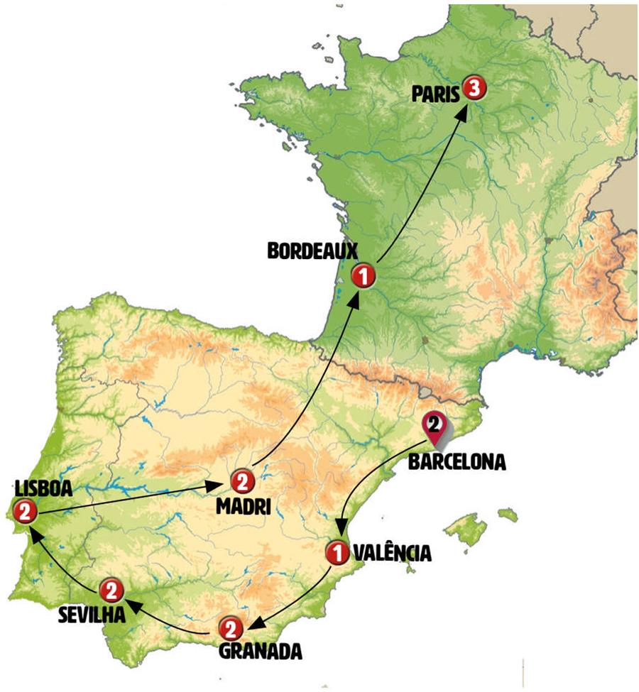 Barcelona, peniscola, Valência, Alicante, Guadix, Granada, Nerja, Málaga, Ronda, Sevilha, Merida, Évora, Lisboa, Cáceres, Madrid, San Sebastian, Bordeaux, Blois, Paris.