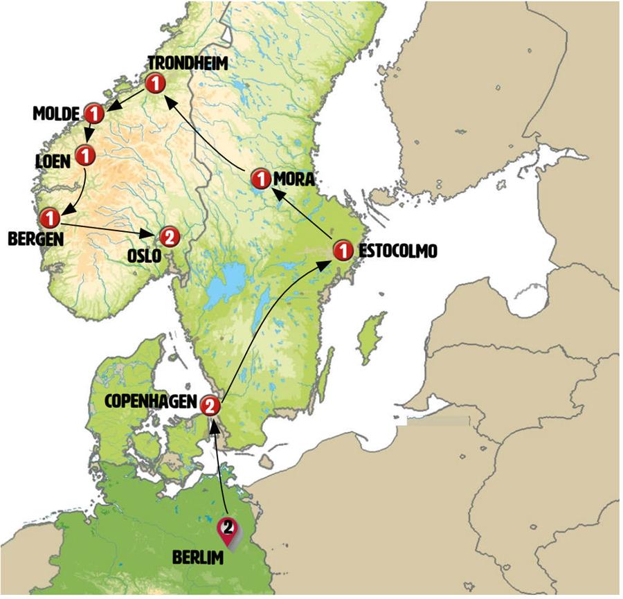 Berlim, Copenhague, jonkoping, vadstena, Estocolmo, Mora, funasdalen, Roros, Trondheim, KRISTIANSUND, carretera atlantica, MOLDE, Geiranger, briksdal, Loen, Bergen, Eidfjord, voringfossen, Geilo, Oslo.