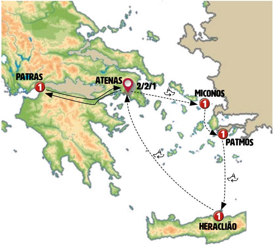 Atenas, Tripoli, Olympia, Patras, Nafpaktos, Micenas, acrocorinto, miconos, Kusadasi, Patmos, Rodes, Heraclion, Santorini.