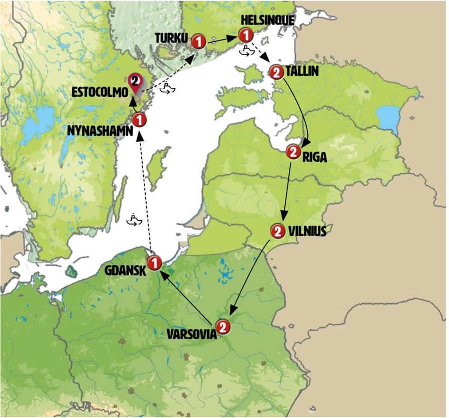 Estocolmo, ferri estocolmo turku, Naantali, Helsinki, ferri helsinki tallin, Tallin, Parnu, Turaida, Sigulda, salaspils, Riga, Rundale, Vilnius, Grutas Park, Augustow, Varsóvia, olsztynek, canal elblag, malbork, Gdansk, Sopot, ferry sopot karlskrona, Vastervik.
