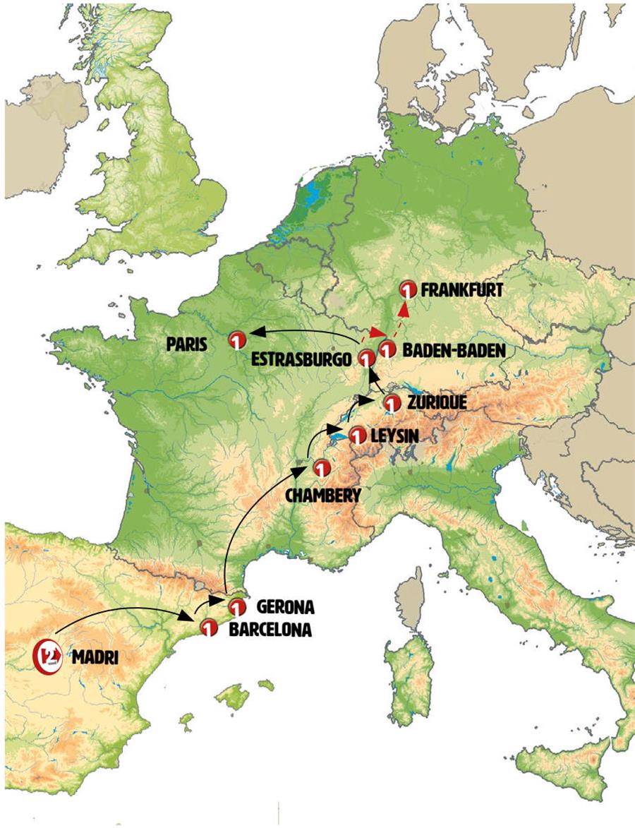 Madrid, Zaragoza, Poblet, Barcelona, Gerona, carrieres de lumiere, Chambery, Genebra, Gruyeres, Leysin, Interlaken, Lucerna, Zurich, basilea, Colmar, Riquewihr, Strasbourg, champagne, Paris.