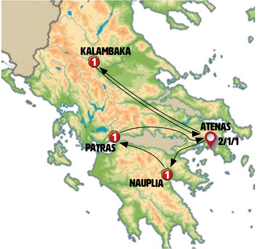 Atenas, Kamena Vourla, Kalambaka, Delfos, Corinto, Poros, Epidauro, Náuplia, Tripoli, Olympia, Patras, Nafpaktos, Micenas, acrocorinto.