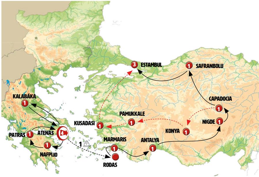 Atenas, Kamena Vourla, Kalambaka, Delfos, Corinto, Poros, Epidauro, Náuplia, Tripoli, Olympia, Patras, Nafpaktos, Micenas, acrocorinto, ferri atenas rodas, Rodes, Marmaris, Dalyan, Antalya, aspendo, Side, karaman , Nigde, Capadócia, ihlara , Konya, Egirdir, Pamukkale, Éfeso, Kusadasi, Esmirna, Bursa, Istambul.