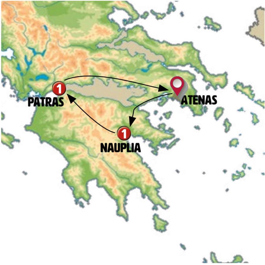 Atenas, Corinto, Poros, Epidauro, Náuplia, Tripoli, Olympia, Patras, Nafpaktos, Micenas, acrocorinto.