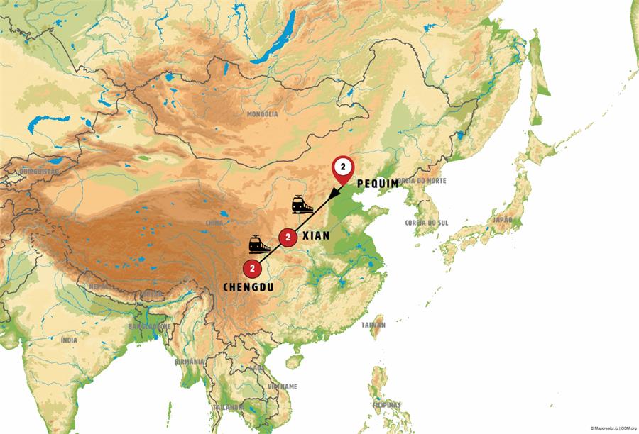 Saímos de Xian em um moderníssimo trem de alta velocidade, em pouco mais de três horas percorremos os 700 km que nos separam de CHENGDU. Almoço incluído na chegada. Após isso, iremos ao Centro de Pesquisa e Reprodução de Ursos Panda; nesta reserva vivem 120 pandas gigantes e 76 pandas vermelhos. À tarde faremos um passeio pelo Parque do Povo, com seu pequeno lago, a população local praticando Taichi e suas casas de chá.