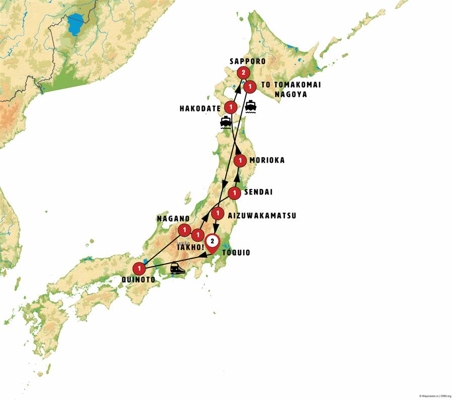 tokio, Kyoto, Tsumago, Matsumoto, Nagano, parque de los monos, kusatsu, ikaho , Nikko, Sendai, matshushima, hiraizumi , Morioka, Hirosaki, Aomori, Hakodate, onuma, Noboribetsu, Sapporo, toyako onsen, monte usu, ferri tomakomai sendai, yamadera , Aizuwakamatsu, ouchijuku.