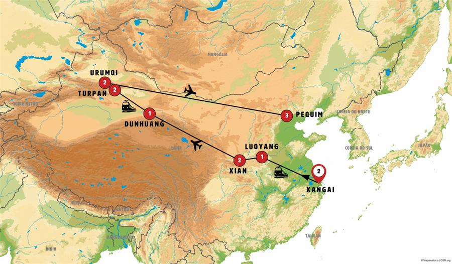 Visita em Turpan (pelo lado de fora) à mesquita Su Gong Ta onde se destaca o Minarete Emin, o mais alto da China, construído durante a dinastia Qing. Depois, visita a um vinhedo local. A continuação, visitaremos o incrível sistema de irrigação Karez, um dos maiores projetos de engenharia da história da China. Saída de ônibus para a prefeitura de Daban, onde podemos passear por seus bazares. Almoço incluído. Continuamos nossa rota para URUMQI, onde visitaremos seu incrível lago salgado e seus moinhos de vento, uma das maiores estações de produção de energia eólica do mundo. Pernoite nesta importante cidade, capital da província de Xinjiang.