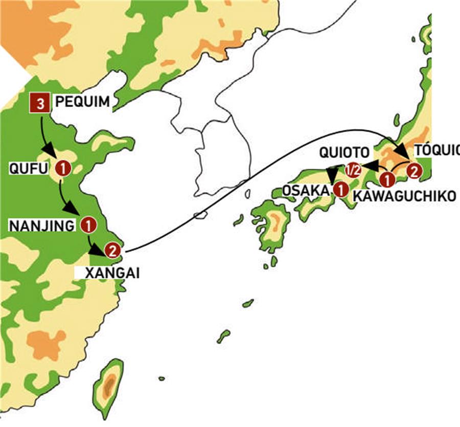 Entradas: Cidade Proibida, Parque Jingshan, Palácio de Verão, Grande Muralha China Mutianyu, Templo do Céu, massagem dos pes, aula de Tai Chi , Templo Dai , Mansão e Templo de Confúcio , Mausoléu subterráneo do imperador da dinastia Han , Mausoléu de Sun Yatsen e Templo Lingu , Jardim do Humilde administrador , Jardim Yuyuan, demostracão da Cerimônia do Chá , Metrô, Templo Zojoji, Templo Meiji, Templo Sensoji, Tokyo Skytree (até o mirante Tembo Deck) , Arakurayama Sengen Park , Santuário Fuji Sengen , Vilarejo Museu , Museu Toyota , Templo de Tenryu-ji, Bosque de Bambu de Arashiyama, Santuário Fushimi Inari, Palácio Imperial, Templo de Kinkaku-ji , Templo de Todai-ji e Templo de Horyu-ji
