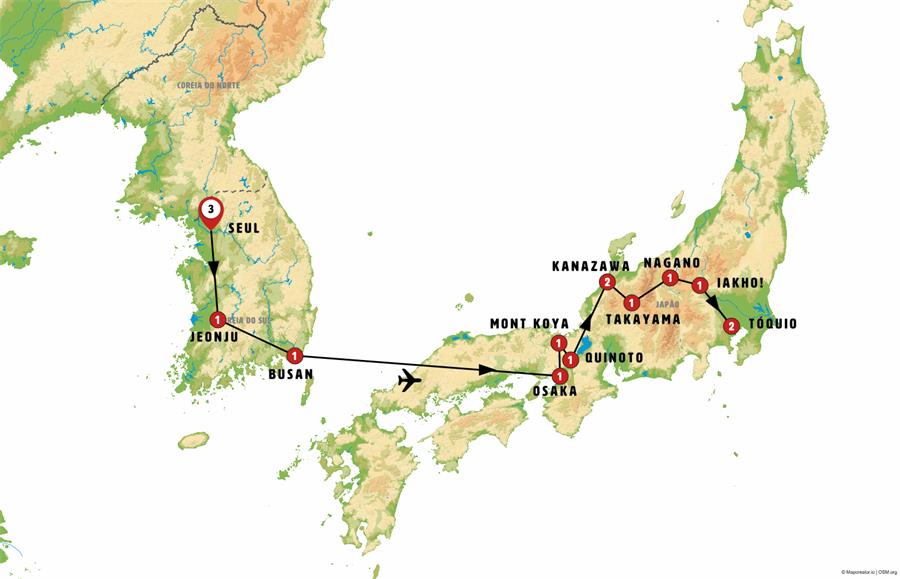 Seul, Suwon, Jeonju, damyang, haeinsa , Busan, Osaka, monte koya, Kyoto, eihei-ji, katsuyama-museo de los dinosaurios, katsuyama, Kanazawa, ainokura, Shirakawago, aldea de hida, Takayama, hida furukawa, Matsumoto, Nagano, parque de los monos, kusatsu, ikaho , Nikko, tokio.