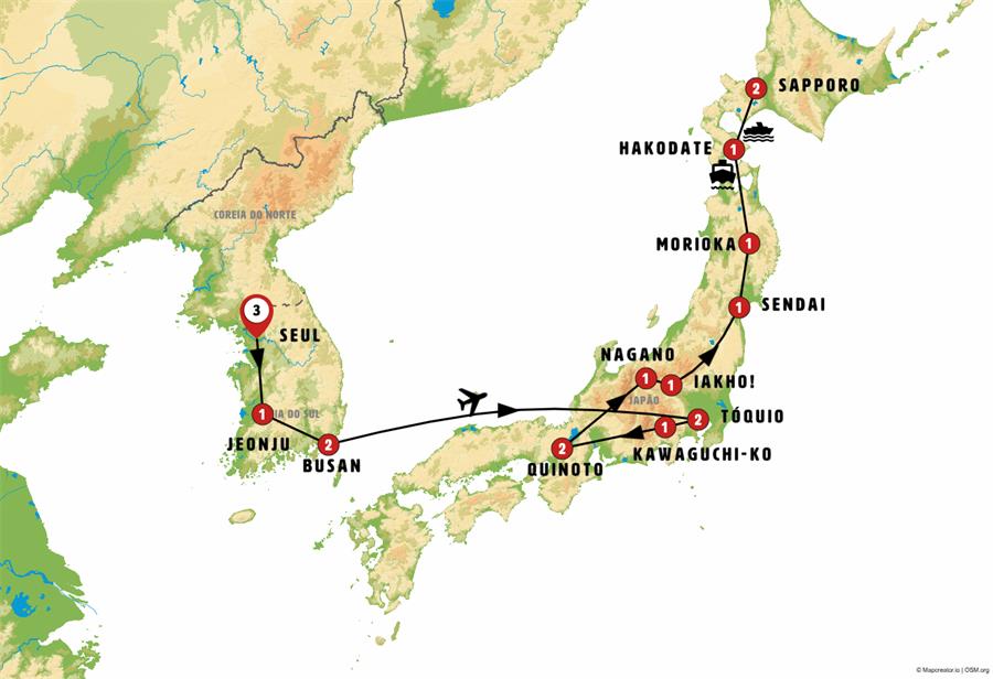 Seul, Suwon, Jeonju, damyang, haeinsa , Busan, tokio, monte fuji, kawaguchiko, iyashi no sato nemba, Toyota, Kyoto, Tsumago, Matsumoto, Nagano, parque de los monos, kusatsu, ikaho , Nikko, Sendai, matshushima, hiraizumi , Morioka, Hirosaki, Aomori, Hakodate, onuma, Noboribetsu, Sapporo.