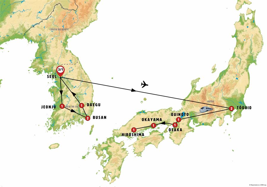 Seul, Suwon, Jeonju, damyang, haeinsa , Busan, seokguram, bulguksa, Gyeongju, Daegu, andong, hahoe, tokio, Kyoto, Nara, Osaka, Himeji, jardines de korakuen, Okayama, Kurashiki, itsukushima, Hiroshima.