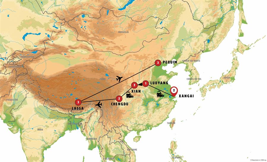 Entradas: Jardim Yuyuan, demostracão da Cerimônia do Chá, Templo budista do Cavalo Branco , Grutas budistas , Templo Baoulon, Museu Guo , Museu do Exercito de Terracota, pequena pagode do ganso e breve espetáculo de instrumentos tradicionais na Torre do Tambor (nem sempre garantido) , Sistema de irrigacão em Dujiangyan, Montanha sagrada de Quingcheng Shan , Palácio de Potala, Mosteiro de Sera , Templo de Jokhang e Norbulingkha , Grande Muralha China Mutianyu, Templo do Céu, massagem dos pes, aula de Tai Chi , Cidade Proibida, Parque Jingshan, Palácio de Verão