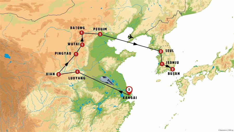 Shanghai, Luoyang, longmen , sanmexia, Xian, lingfen, mansion clan wang , Pingyao, wutai , yanmenguan , yingxian, templo colgante, Datong, jiming post, Beijing, Seul, Suwon, Jeonju, damyang, haeinsa , Busan.