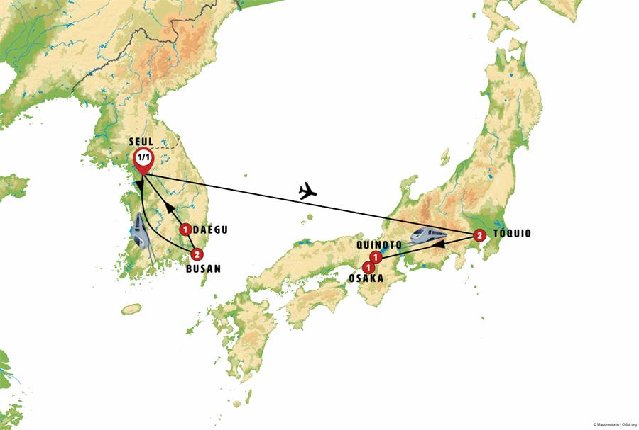 Seul, Busan, seokguram, bulguksa, Gyeongju, Daegu, andong, hahoe, tokio, Kyoto, Nara, Osaka.