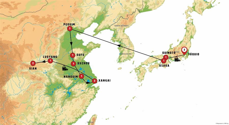 Entradas: Metrô, Templo Zojoji, Templo Meiji, Templo Sensoji, Tokyo Skytree (até o mirante Tembo Deck), Fushimi Inari, Palacio Imperial, Templo de Kinkakuji , Templo de Todai-ji e Templo de Horyu-ji , Cidade Proibida, Parque Jingshan, Palácio de Verão , Grande Muralha China Mutianyu, Templo do Céu, massagem dos pes, aula de Tai Chi , Templo Dai , Mansão e Templo de Confúcio , Mausoléu subterráneo do imperador da dinastia Han , Mausoléu de Sun Yatsen e Templo Lingu , Jardim do Humilde administrador , Jardim Yuyuan, demostracão da Cerimônia do Chá , Templo budista do Cavalo Branco , Grutas budistas , Templo Baoulon, Museu Guo , Museu do Exercito de Terracota, pequena pagode do ganso e breve espetáculo de instrumentos tradicionais na Torre do Tambor (nem sempre garantido)
