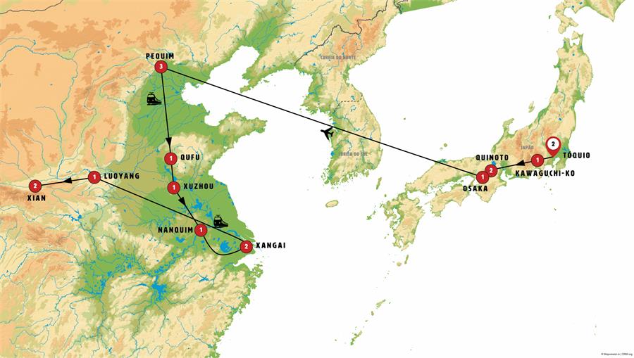 Entradas: Metrô, Templo Zojoji, Templo Meiji, Templo Sensoji, Tokyo Skytree (até o mirante Tembo Deck), Arakurayama Sengen Park , Santuário Fuji Sengen , Vilarejo Museu , Museu Toyota , Templo de Tenryu-ji, Bosque de Bambu de Arashiyama, Santuário Fushimi Inari, Palácio Imperial, Templo de Kinkaku-ji , Templo de Todai-ji e Templo de Horyu-ji , Cidade Proibida, Parque Jingshan, Palácio de Verão , Grande Muralha China Mutianyu, Templo do Céu, massagem dos pes, aula de Tai Chi , Templo Dai , Mansão e Templo de Confúcio , Mausoléu subterráneo do imperador da dinastia Han , Mausoléu de Sun Yatsen e Templo Lingu , Jardim do Humilde administrador , Jardim Yuyuan, demostracão da Cerimônia do Chá , Templo budista do Cavalo Branco , Grutas budistas , Templo Baoulon, Museu Guo , Museu do Exercito de Terracota, pequena pagode do ganso e breve espetáculo de instrumentos tradicionais na Torre do Tambor (nem sempre garantido)