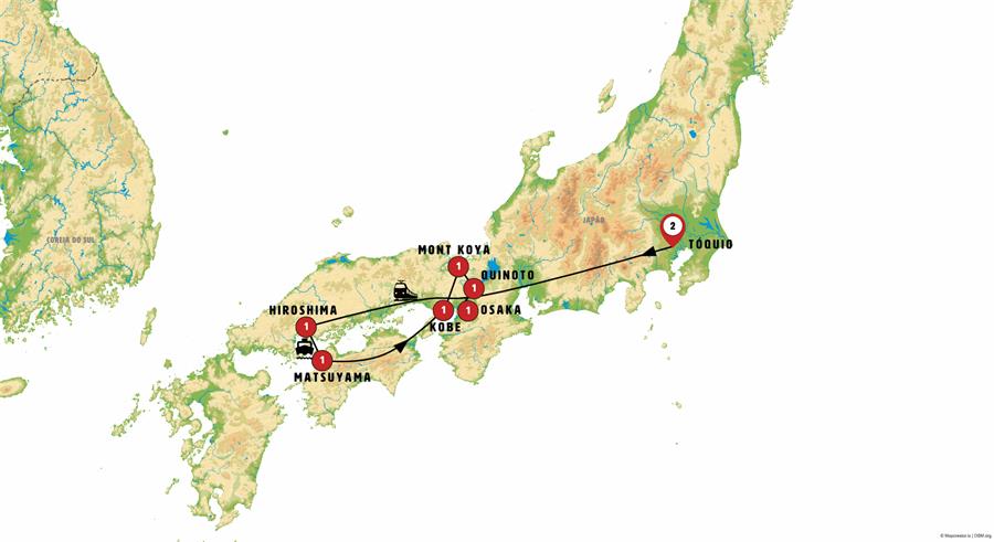 tokio, Hiroshima, Matsuyama, Kotohira, Takamatsu, Naruto, Kobe, Osaka, monte koya, Kyoto, Nara.