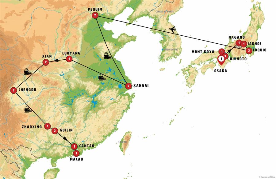 Osaka, monte koya, Kyoto, Tsumago, Matsumoto, Nagano, parque de los monos, kusatsu, ikaho , Nikko, tokio, monte fuji, kawaguchiko, Beijing, Shanghai, Luoyang, longmen , sanmexia, Xian, Chengdu, pueblo miao, zhaoxing, guangxiao, chengyang, longsheng, Guilin, crucero por el rio li, yangshuo, huangyao, canton, Zhuhai, Macau.