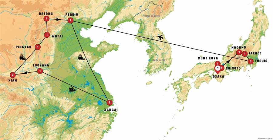 Entradas: Mausoléu de Okuno, Templo de Kongobu-ji e Ajikan ou Zazen meditaão no Monte Koya, Santuário Fushimi Inari, Palácio Imperial, Templo de Kinkaku-ji , Castelo do Matsumoto , Templo Zenko-ji, Cerimônia do Gomakuyo, Parque dos Macacos em Jigokudani em Nagano , Templo Toshogu, Mausoléu Taiyuinbyo em Nikko. , Metrô, Templo Zojoji, Templo Meiji, Templo Sensoji, Tokyo Skytree (até o mirante Tembo Deck) , Arakurayama Sengen Park , Santuário Fuji Sengen , Cidade Proibida, Parque Jingshan, Palácio de Verão , Grande Muralha China Mutianyu , Jardim Yuyuan, demostracão da Cerimônia do Chá , Templo budista do Cavalo Branco , Grutas budistas , Templo Baoulon, Museu Guo , Museu do Exercito de Terracota, pequena pagode do ganso e breve espetáculo de instrumentos tradicionais na Torre do Tambor (nem sempre garantido) , Mansão do Clã Wang , Templos, mansões e muralha , Templo Nanshan , Grande Muralha , Templo Suspenso , Grutas de Yungang , Vilarejo tradicional chinês