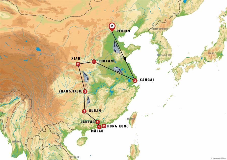 Beijing, Shanghai, Luoyang, longmen , sanmexia, Xian, Zhangjiajie, Guilin, crucero por el rio li, yangshuo, huangyao, canton, Zhuhai, Macau, Hong Kong.