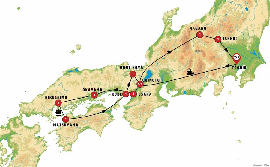 tokio, Kyoto, Nara, Osaka, Himeji, jardines de korakuen, Okayama, Kurashiki, itsukushima, Hiroshima, Matsuyama, Kotohira, Takamatsu, Naruto, Kobe, monte koya, Tsumago, Matsumoto, Nagano, parque de los monos, kusatsu, ikaho , Nikko.
