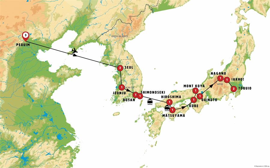 Entradas: Cidade Proibida, Parque Jingshan, Palácio de Verão, Grande Muralha China Mutianyu, Templo do Céu, massagem dos pes, aula de Tai Chi , Palácio Changdeokgung, Bukchon Hanok Village, Memorial da Guerra de Coreia , Palácio de Gyeongbokgung , Fortaleza de Suwon, Palácio de verão de Hwaseong Haenggung , Hanok Village , Floresta de Bambu Juknokwon e Museu do Bambu , Templo Budista de Haeinsa , Templo de Haedong Yongung, Memorial das Nações Unidas , Ponte de Kintaikyo em Iwakuni , Templo Itsukushima , Museu da Paz , Dogo Onsen, Templo Ishiteji , Santuário sintoísta , Jardins Ritsurin , Ponte de Naruto , Museu Memorial do Terremoto , Mausoléu de Okuno, Templo de Kongobu-ji e Ajikan ou Zazen meditaão no Monte Koya , Santuário Fushimi Inari, Palácio Imperial, Templo de Kinkaku-ji , Castelo do Matsumoto , Templo Zenko-ji, Cerimônia do Gomakuyo, Parque dos Macacos em Jigokudani em Nagano , Templo Toshogu, Mausoléu Taiyuinbyo em Nikko. , Metrô, Templo Zojoji, Templo Meiji, Templo Sensoji, Tokyo Skytree (até o mirante Tembo Deck)