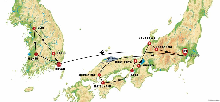 tokio, Hiroshima, Matsuyama, Kotohira, Takamatsu, Naruto, Kobe, Osaka, monte koya, Kyoto, eihei-ji, katsuyama-museo de los dinosaurios, katsuyama, Kanazawa, ainokura, Shirakawago, aldea de hida, Takayama, hida furukawa, Matsumoto, Busan, seokguram, bulguksa, Gyeongju, Daegu, andong, hahoe, Seul, Suwon, Jeonju, damyang, haeinsa .