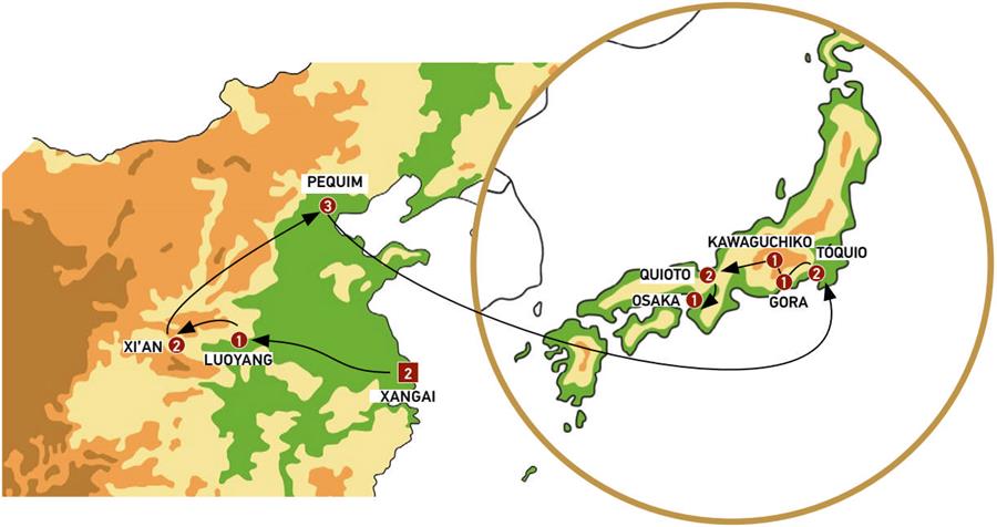 Entradas: Jardim Yuyuan, demostracão da Cerimônia do Chá, Templo budista do Cavalo Branco , Grutas budistas , Templo Baoulon, Museu Guo , Museu do Exercito de Terracota, pequena pagode do ganso e breve espetáculo de instrumentos tradicionais na Torre do Tambor (nem sempre garantido) , Cidade Proibida, Parque Jingshan, Palácio de Verão , Grande Muralha China Mutianyu, Templo do Céu, massagem dos pes, aula de Tai Chi , Metrô,Templo Zojoji, Templo Meiji, Templo Sensoji, Tokyo Skytree (até o mirante Tembo Deck) , Templo Hokoku-ji e bosque de bambú, Templo Sugimoto-dera, Grande Buda (Daibutsu) , Castelo , Castelo , Castelo , Santuário Fuji Sengen , Vilarejo Museu , Museu Toyota , Templo de Tenryu-ji, Bosque de Bambu de Arashiyama, Santuário Fushimi Inari, Palácio Imperial, Templo de Kinkaku-ji , Templo de Todai-ji e Templo de Horyu-ji