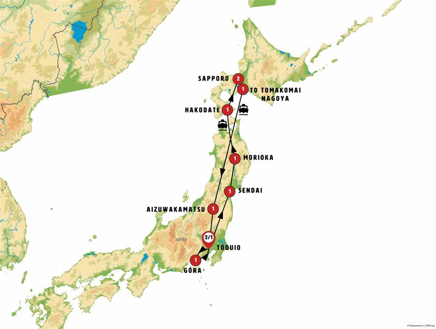 tokio, Nikko, Sendai, matshushima, hiraizumi , Morioka, Hirosaki, Aomori, Hakodate, onuma, Noboribetsu, Sapporo, toyako onsen, monte usu, ferri tomakomai sendai, yamadera , Aizuwakamatsu, ouchijuku, Kamakura, enoshima, Odawara, monte fuji, kawaguchiko.
