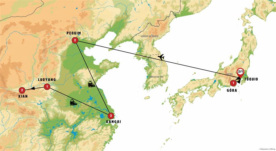 Entradas: Metrô,Templo Zojoji, Templo Meiji, Templo Sensoji, Tokyo Skytree (até o mirante Tembo Deck), Templo Hokoku-ji e bosque de bambú, Templo Sugimoto-dera, Grande Buda (Daibutsu) , Castelo , Castelo , Castelo , Santuário Fuji Sengen , Cidade Proibida, Parque Jingshan, Palácio de Verão , Grande Muralha China Mutianyu , Jardim Yuyuan, demostracão da Cerimônia do Chá , Templo budista do Cavalo Branco , Grutas budistas , Templo Baoulon, Museu Guo , Museu do Exercito de Terracota, pequena pagode do ganso e breve espetáculo de instrumentos tradicionais na Torre do Tambor (nem sempre garantido)