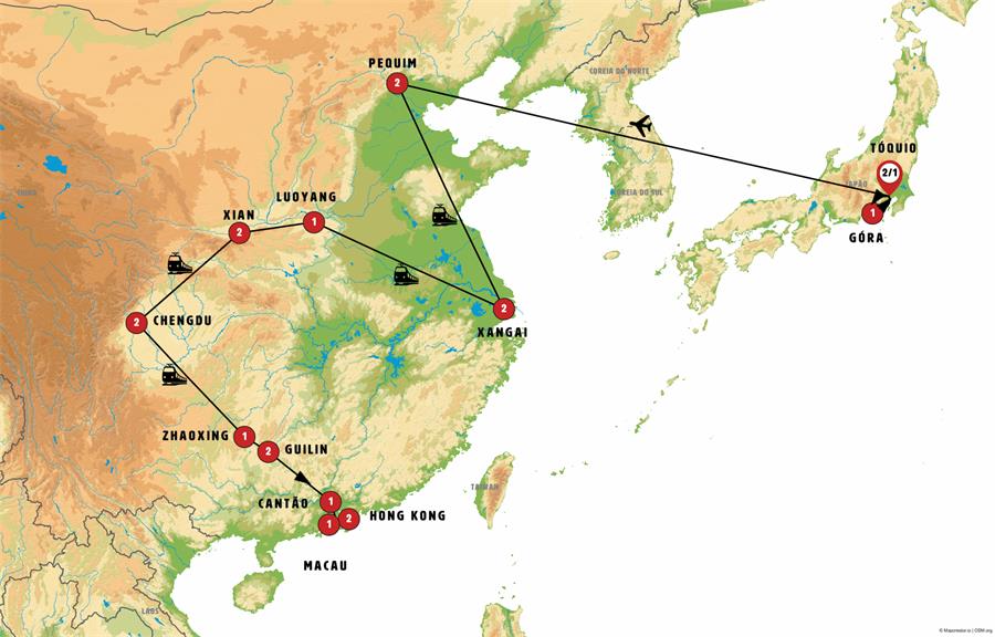 Entradas: Metrô,Templo Zojoji, Templo Meiji, Templo Sensoji, Tokyo Skytree (até o mirante Tembo Deck), Templo Hokoku-ji e bosque de bambú, Templo Sugimoto-dera, Grande Buda (Daibutsu) , Castelo , Castelo , Castelo , Santuário Fuji Sengen , Cidade Proibida, Parque Jingshan, Palácio de Verão , Grande Muralha China Mutianyu , Jardim Yuyuan, demostracão da Cerimônia do Chá , Templo budista do Cavalo Branco , Grutas budistas , Templo Baoulon, Museu Guo , Museu do Exercito de Terracota, pequena pagode do ganso e breve espetáculo de instrumentos tradicionais na Torre do Tambor (nem sempre garantido) , Sistema de irrigacão em Dujiangyan, Montanha sagrada de Quingcheng Shan , Aldeia Basha Miao , Vilarejo Zhaoxing da etnia Dong , Vilarejo Guangxiao da etnia Dong , Ponte do vento , Arrozeiras , Gruta das Flautas de Cana , Cidade antiga , Casa do clã Chen , Museu de Historia