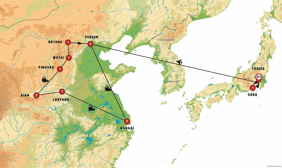 Entradas: Metrô,Templo Zojoji, Templo Meiji, Templo Sensoji, Tokyo Skytree (até o mirante Tembo Deck), Templo Hokoku-ji e bosque de bambú, Templo Sugimoto-dera, Grande Buda (Daibutsu) , Castelo , Castelo , Castelo , Santuário Fuji Sengen , Cidade Proibida, Parque Jingshan, Palácio de Verão , Grande Muralha China Mutianyu , Jardim Yuyuan, demostracão da Cerimônia do Chá , Templo budista do Cavalo Branco , Grutas budistas , Templo Baoulon, Museu Guo , Museu do Exercito de Terracota, pequena pagode do ganso e breve espetáculo de instrumentos tradicionais na Torre do Tambor (nem sempre garantido) , Mansão do Clã Wang , Templos, mansões e muralha , Templo Nanshan , Grande Muralha , Templo Suspenso , Grutas de Yungang , Vilarejo tradicional chinês