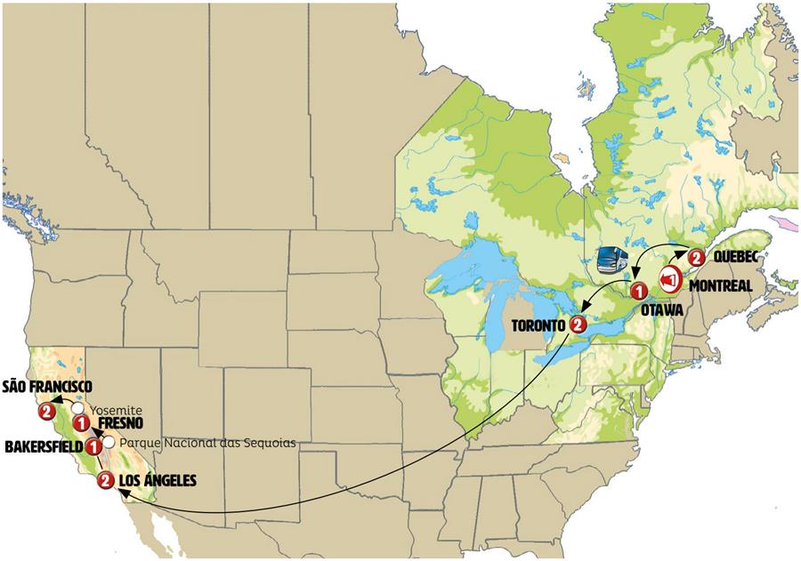 Montreal, Quebec, Sainte-Agathe-des-Monts, Mont Tremblant , Ottawa, Mil Ilhas, Toronto, niagara on the lake, Cataratas do Niagara, Los Angeles, Santa Monica, Solvang, Bakersfield, Parque Nacional da Sequoia, Fresno, Yosemite, San Francisco SFO.